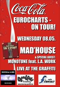 by wimThis evening wednesday 8 May 2002 Coca-Cola eurocharts on tour will take place in club Graffiti in Lontzen: withe Live on stage MadHouse and as special guest Monotone feat. L.A.Work!!!!